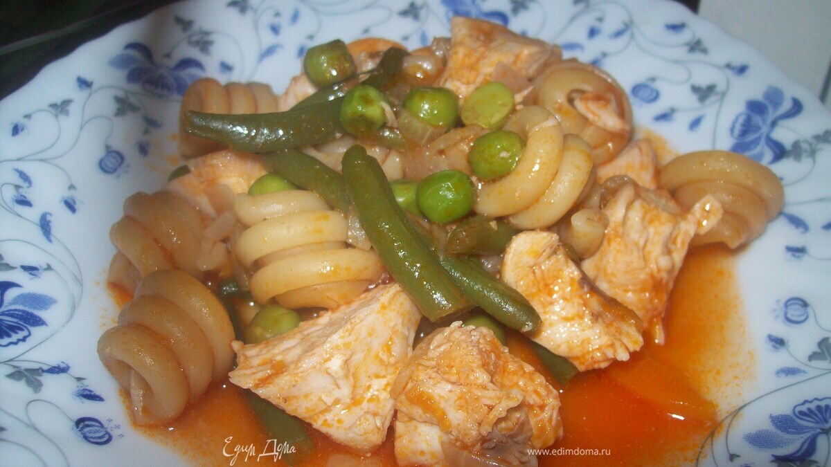 через три минуты добавляем ложку томатной пасты и нарезанную курицу. перемешиваем. закрываем крышку и тушим еще 4 минуты. смотрите что бы жидкости для варки макарон хватило. если мало будет добейте кипятка - Шаг 8