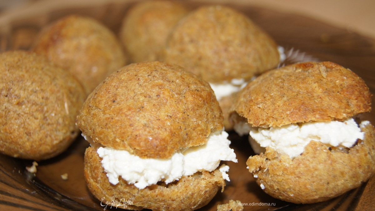 Миндаль подсушить в духовке до золотистого цвета, порубить, смешать с творогом и медом. Начинить остывшие булочки. Приятного аппетита!!