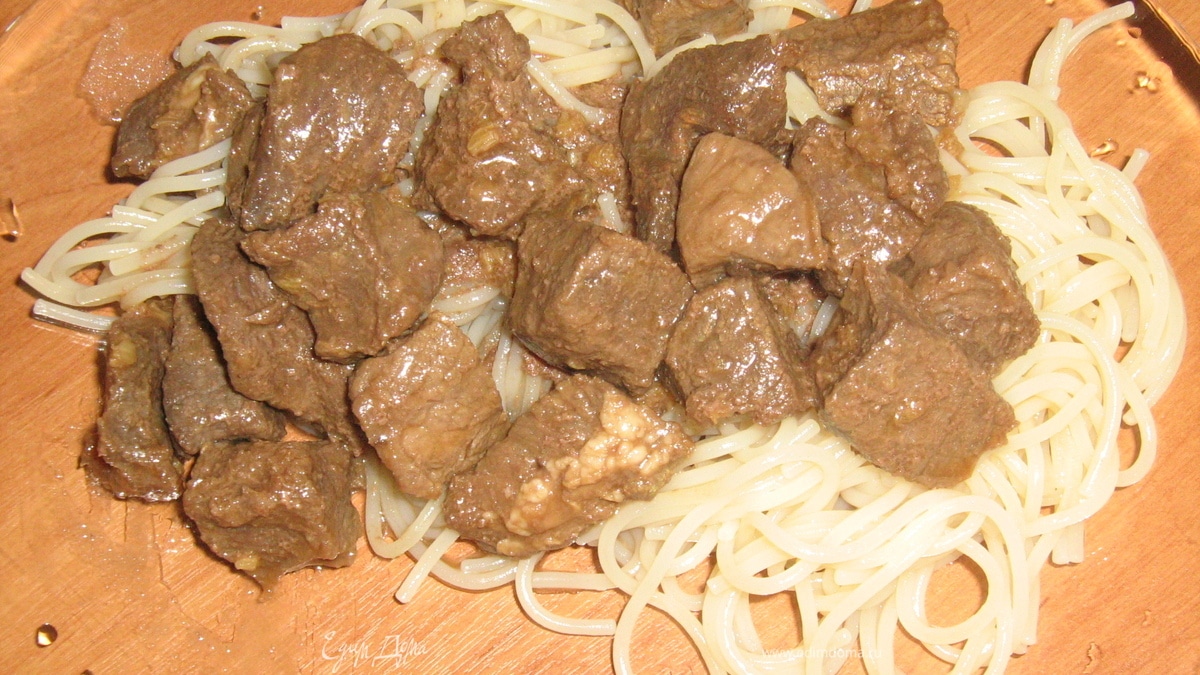 - Шаг 1Мясо порезать на мелкие кусочки, залить маринадом, хорошо перемешать и оставить на 30 минут мариноваться.Тушить под крышкой вместе с соусом (маринадом) 1-1,5 часа (пока не станет мягким). В конце добавить рубленный чеснок. Гарнир можно любой.