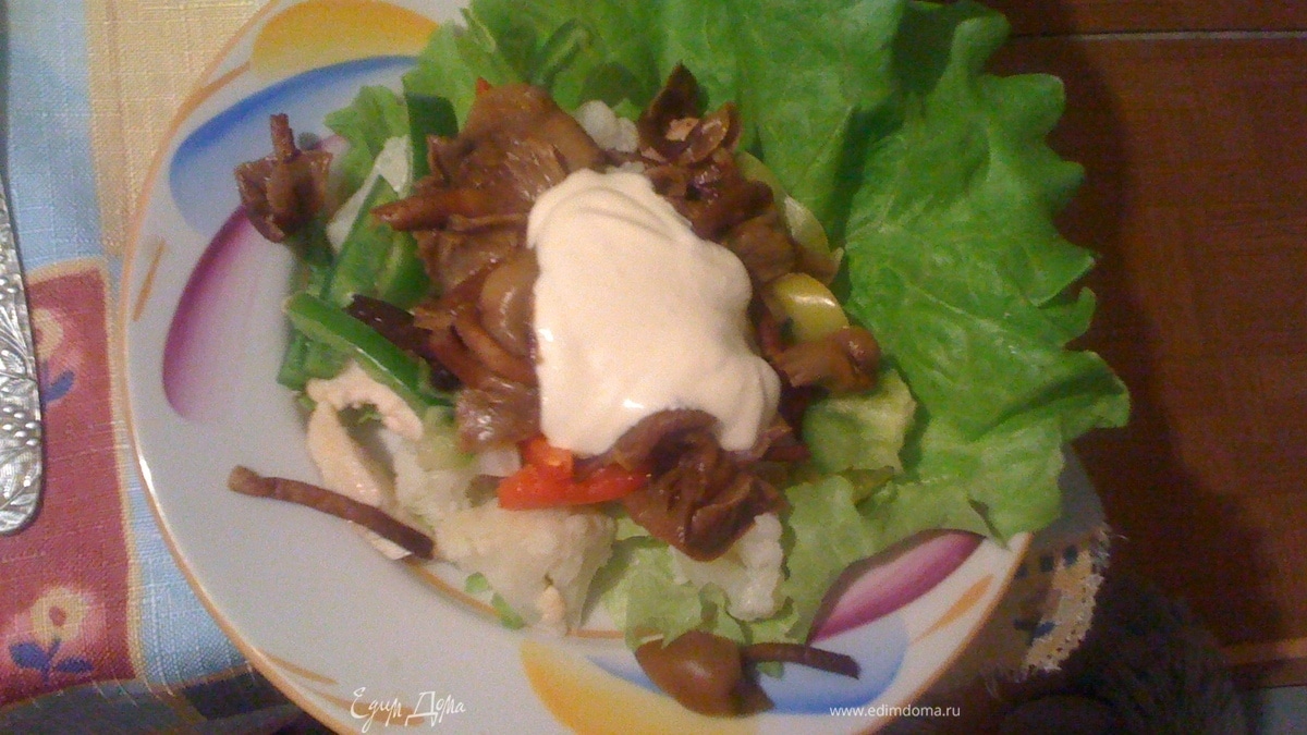 - ПодготовкаОтварить цветную капусту и куриную грудку в слегка подсоленой воде, остудить, порвать курицу на волокна. На тарелку положить лист салата, по очереди выклвдываем цветную капусту, курицу, порезаный соломкой болгарский перец, маринованные опята. Сверху поливаем соусом: смешиваем сметану,майонец,горчицу.