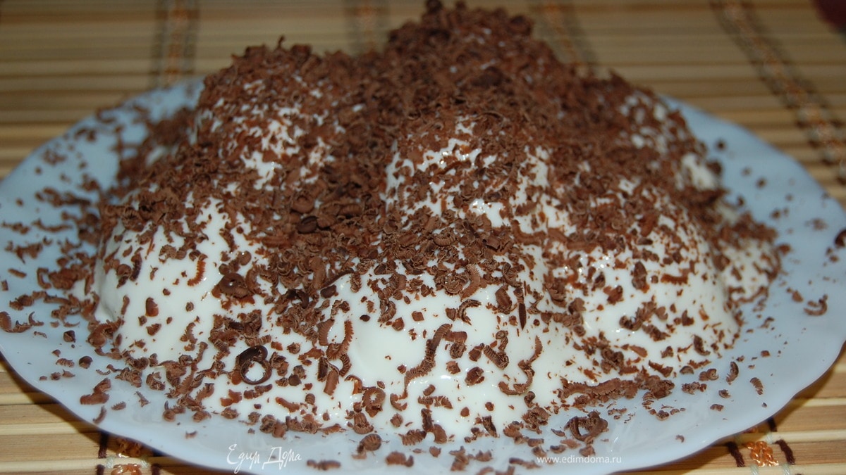 200г сметаны смешать с оставшейся пудрой (можно взбить), полить творожную горку. Сверху потереть шоколад.