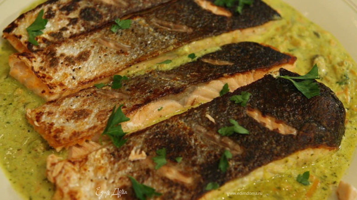 Сливочный соус вылить в глубокую посуду и выложить на него семгу кожей вверх.