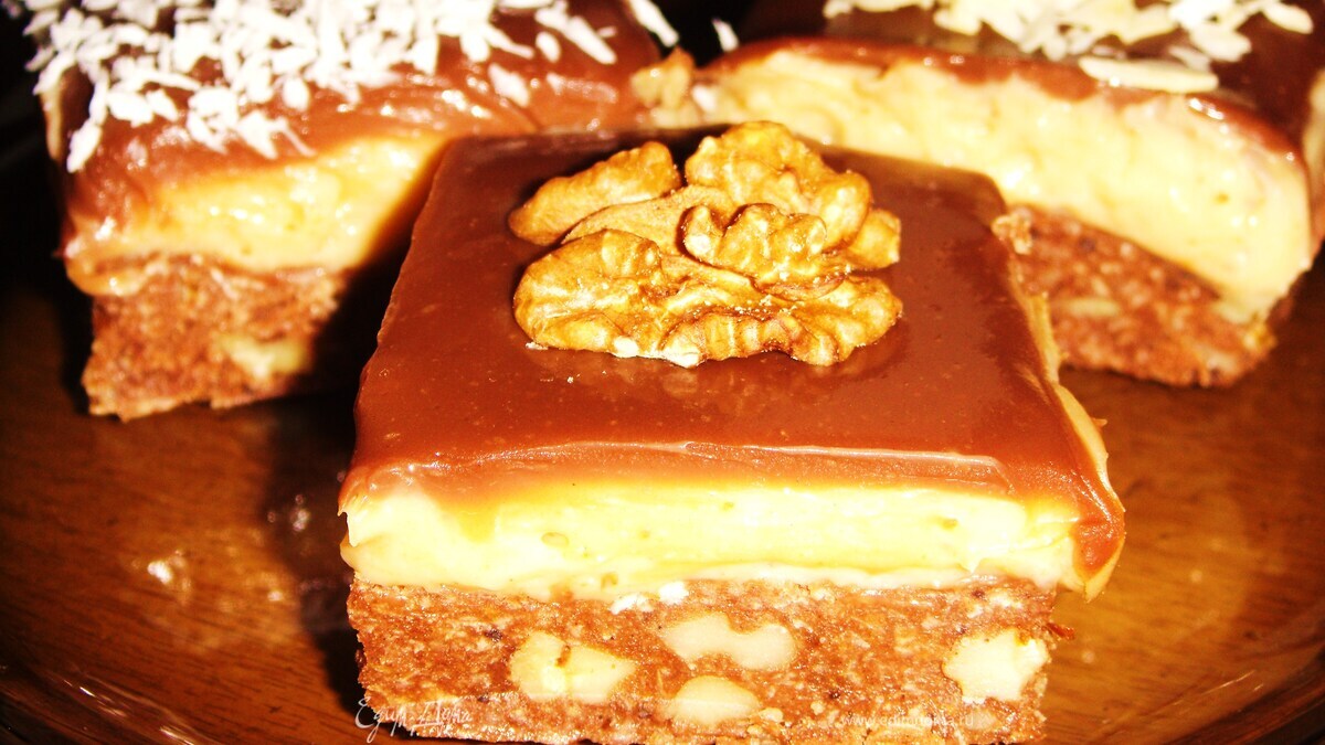 Нарезаем на небольшие квадратики или прямоугольники, украшаем половинкой ореха, миндалем или кокосовой стружкой. Можно и не украшать, они и так хороши))