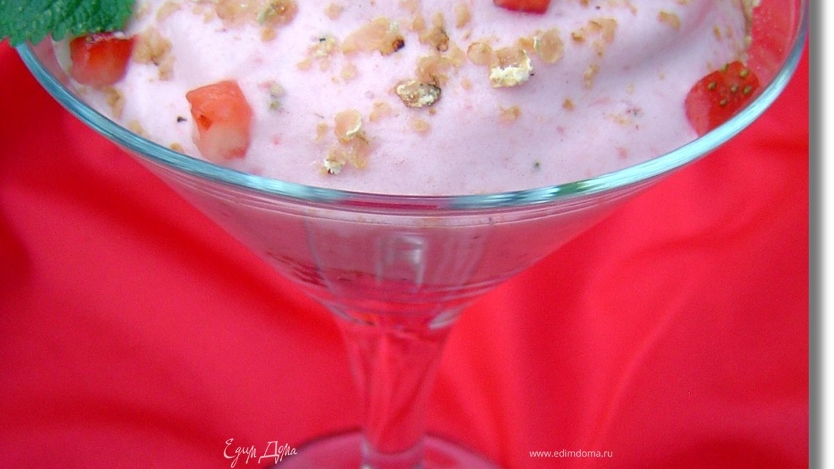 Отделяем белки от желтков, охлаждаем и взбиваем до образования легкой пены. Затем добавляем клубнику, и сахар и на высоких оборотах взбиваем все до образования густой массы. Овсяные хлопья обжариваем до золотистого цвета на сухой сковороде, охлаждаем. На дно бокала кладем кусочки клубники, затем обжаренные овсяные хлопья, а сверху выкладываем клубнично-белковую массу. Украшаем и подаем в качестве вкуснейшего десерта! Приятного аппетита!!! - Шаг 2