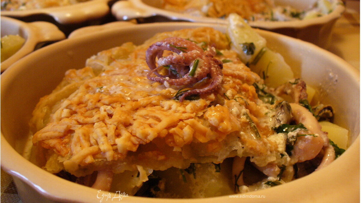 - Шаг 1Картофель порежьте мелкими кусочками, отварите до полуготовности (лучше – в пароварке) и выложите на дно формы. Морской коктейль и кусочки рыбы посолите, поперчите и положите ровным слоем на картофель. Приготовьте соус: соедините 1 стакан сливок, ½ стакана куриного бульона, вино, ½ стакана рубленой зелени и ложку цедры лайма. Все тщательно перемешайте и залейте соусом картофель и морепродукты. Сверху положите тонкий слой слоеного теста и засыпьте тертым сыром. Поставьте в духовку и выпекайте около 30-35 минут при 180С. Подавайте с листьями зеленого салата.