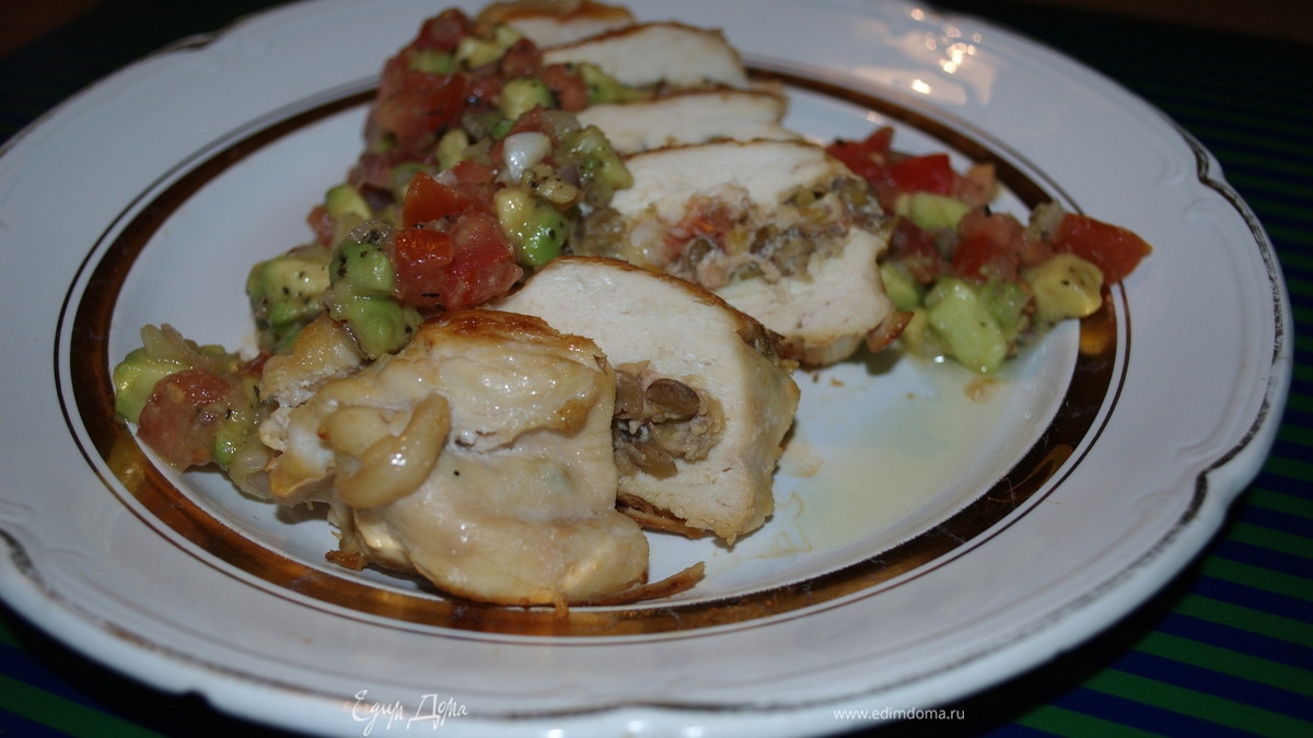 - Шаг 4Готовую курицу подавать, украсив любой зеленью, вместе с овошной сальсой.
