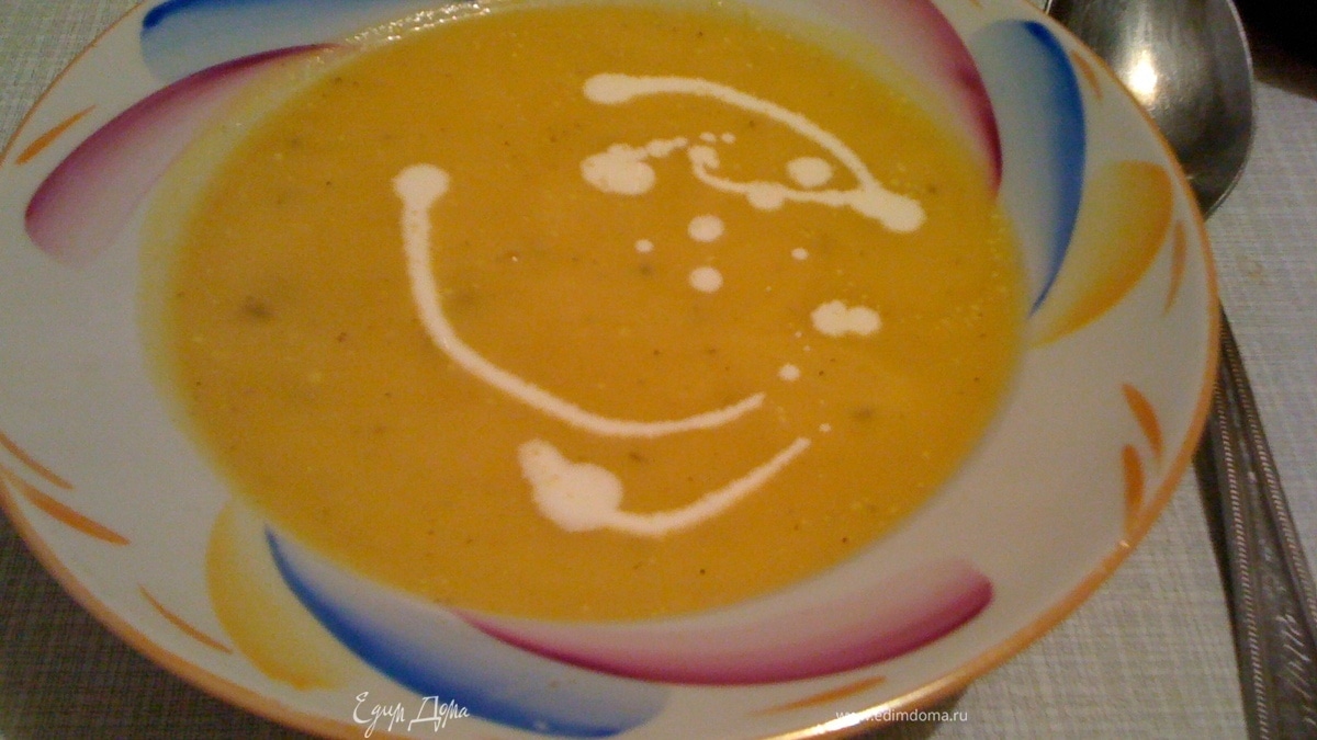 Подавать суп украшенный сливками и зеленью по вкусу.