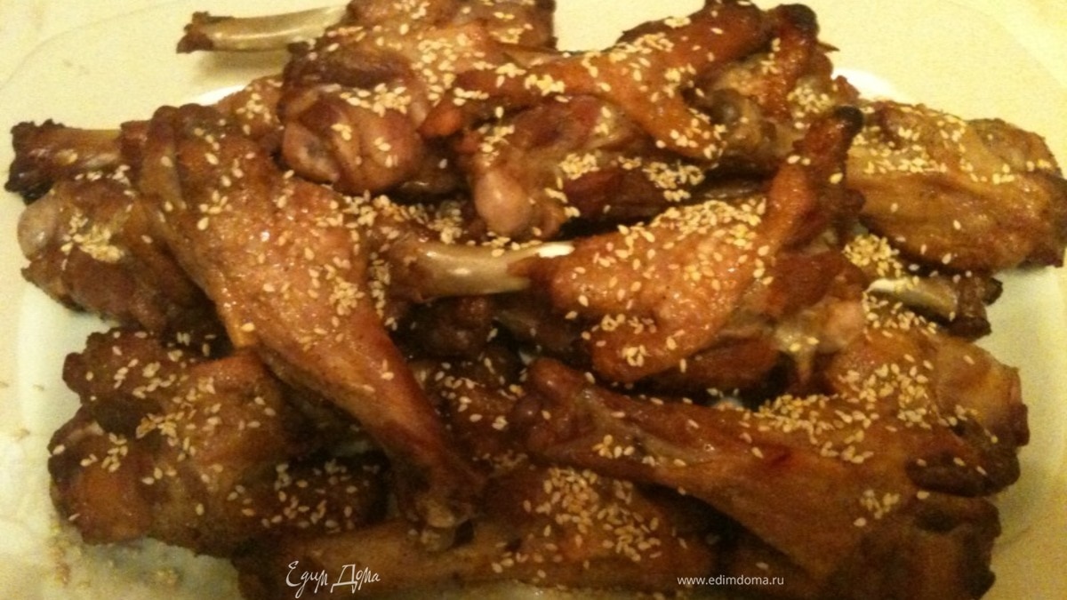 Готовые крылышки выложить на блюдо и посыпать кунжутом. Сразу же подавать к столу. Приятного аппетита!