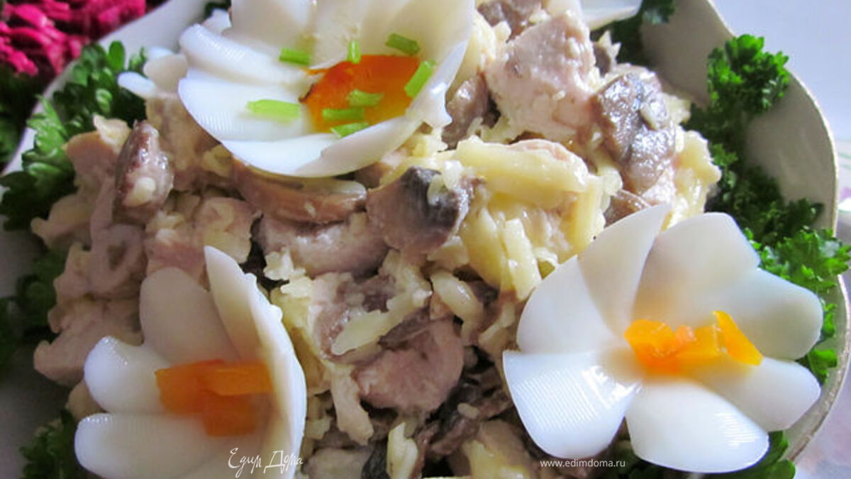 - ПодготовкаГрудку сварить, остудить, нарезать кубиками. Грибы тонко порезать и обжарить на растительном масле. Сыр натереть на крупной тёрке. Всё соединить, заправить майонезом.
