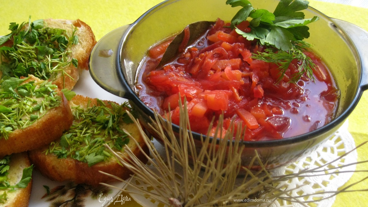 - Шаг 3Чудесно получилось! Борщ горячий, ароматный. Посыплю его рубленой зеленью и попробую. Свеколка, как я люблю, с хрустом, а картошечка мягкая. Пикантные греночки в самый раз. Сейчас бы рюмочку принять, да нельзя. Пост!