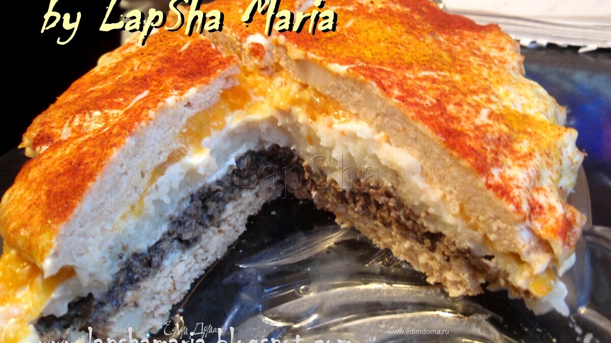 32Машенька!Вот это блюдо!Искусство!Такой подробный,шикарный рецепт!+5.Спасибо за отличную идею.До Твоего рецепта я думала,что фаршированный многослойный пирог(я видела только подобие печёночный однослойный)невозможен.+5.Молодец!