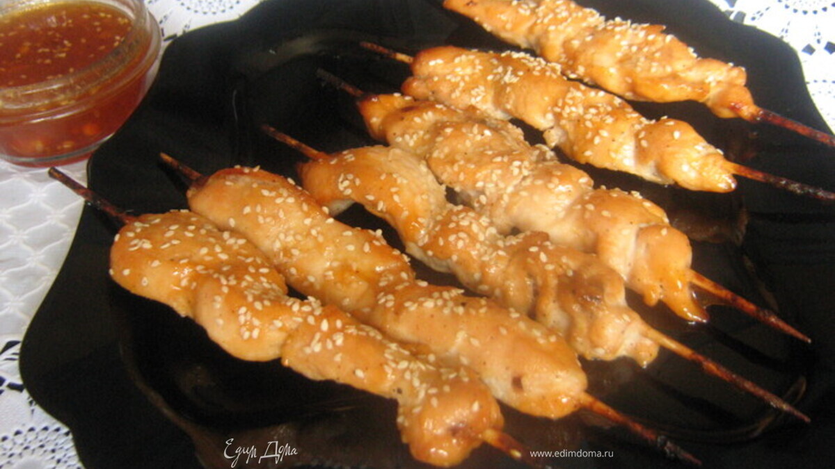 Шашлычок из куриной грудки под мармеладным маринадом.