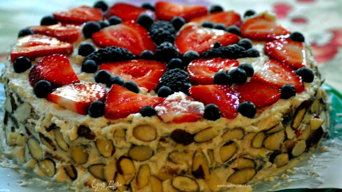 - Шаг 18Смазать края и верх торта кремом. Украсить орехами.