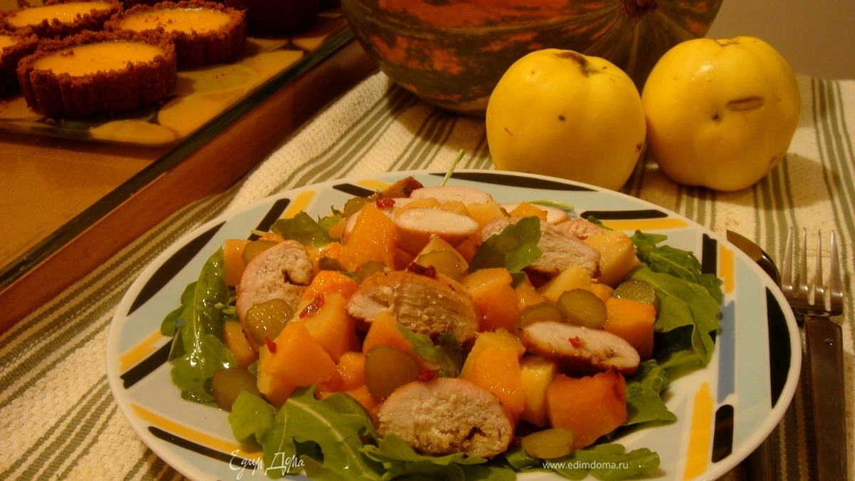 16Ингредиенты 1 маленькая куриная грудка 0,5 айвы ок.100 гр тыквы 2 маленьких корнишона руккола горсть тыквенных семечек Маринад для курицы: 0,5 ст.л.соевого соуса 0,5 ст.л.лимонного сока 1 ст.л.растительного масла щепотка молотого кориандра 0,5 ч.л.мелко нарезанного острого перца соль,смесь перцев Заправка: 1 ст.л.оливкового масла 0,5 ст.л.винного уксуса или лимонного сока соль,смесь перцев