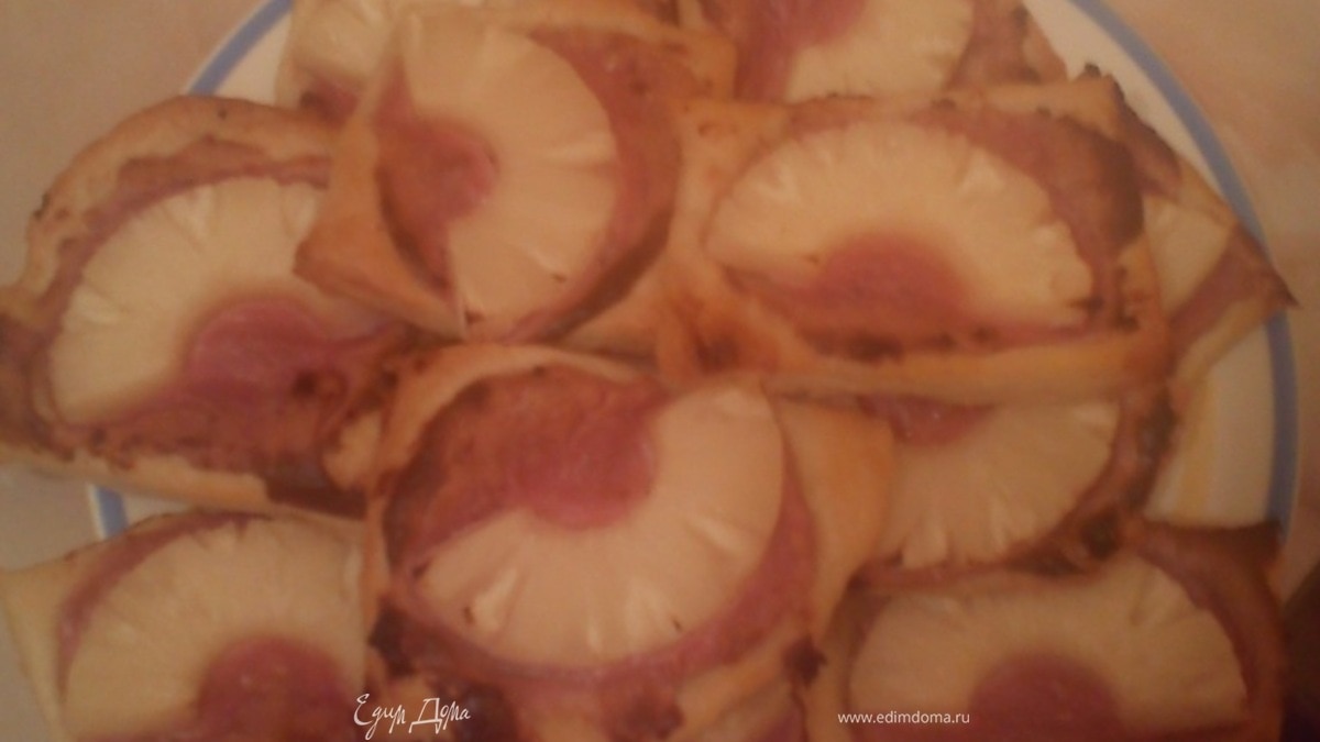 - Шаг 1Тесто режем на квадратики, каждый смазываем творожной массой, свержу кладем разрезанный пополам кусочек ананаса.Ставим в духовку на 15 мин
