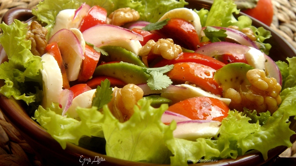 Хурму,авокадо,помидор и моцареллу нарезать дольками,лук-полукольцами,салатные листья порвать на части.Смешать все ингредиенты.Отдельно взбить вилкой заправку и полить ей салат,украсить листиками кинзы и посыпать орехами.Приятного аппетита!