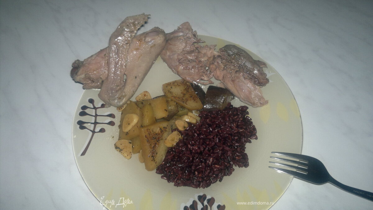 А для овощного дополнения берем маленький баклажан и капусту кольраби. Обжариваем почти без масла, как на гриле, кольраби готовится долго ( она как картофель или корень сельдерея ), обжариваем до золотистого цвета и добавляем чуть – чуть воды и специи ( базилик, сушеный помидор, черный перец и морская соль ). Все готово, мы смогли сохранить максимум мяса утки и оно осталось сочным, бульон можно использовать и для других блюд, главное снимайте пенку в процессе его приготовления и лучше снять кожу с утки, тогда он будет диетическим. А так же приготовили отличный гарнир из питательного риса и хрустящих овощей .