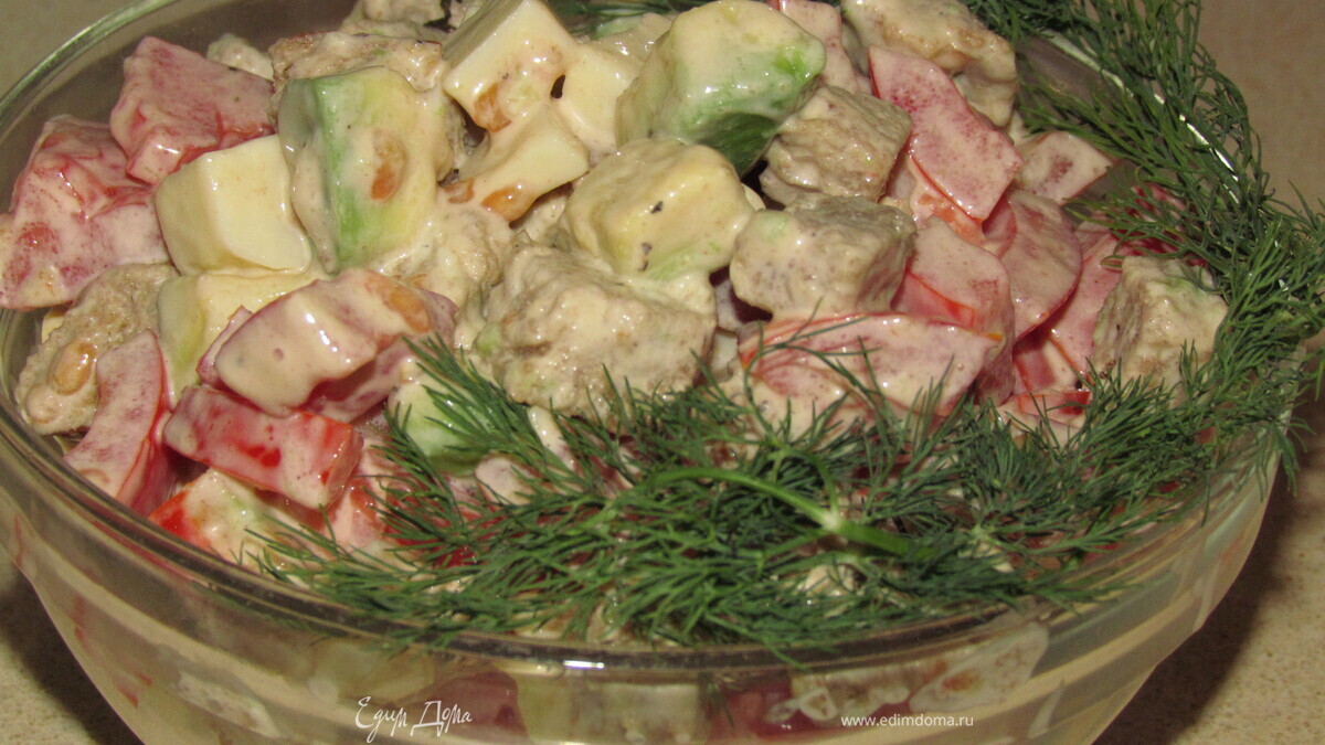 - Шаг 1Авокадо, помидоры и моцареллу нарезать кубиками. Хлеб порезать кубиками, поджарить на сухой сковородке. Все смешать, заправить чесноком(через чеснодавку) и майонезом. Можно посолить и поперчить по вкусу. Приятного аппетита!!