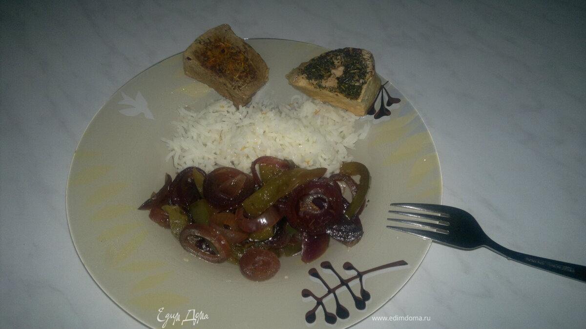 Говядина в стиле южных штатов америки с индийским оттенком + свинина в стиле прованса и гарнир из белого риса и обжареных в бальзамике перца и лука
