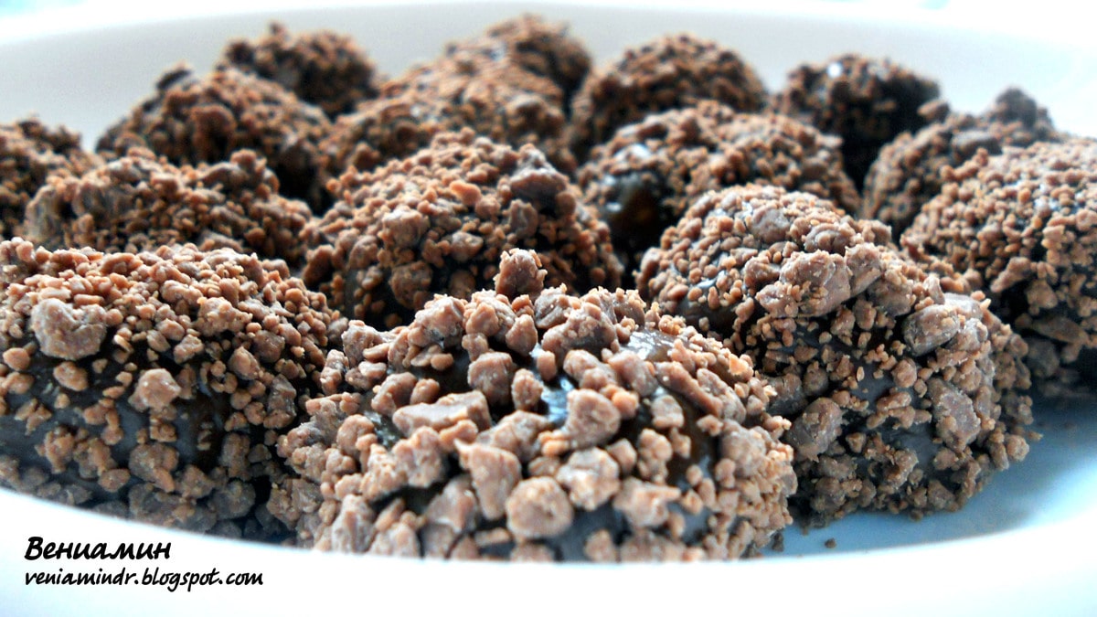 Обвалять в тертом шоколаде ***идеальный внешний вид конфетам должна придавать кондитерская посыпка, как на фото (позаимствовано из сети), у меня такой, увы, не нашлось***. Дальше, как обычно: до подачи хранить в холодильнике или быстро съесть:) Вкусные конфеты, что-то между трюфельной текстурой и тоффи.