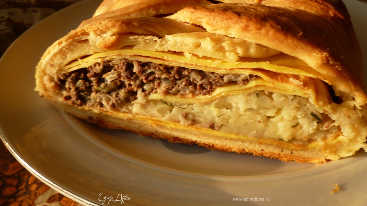 Блинчики режем пополам. Берем две половики и выкладываем на раскатанное тесто по серединке. На блины по всей длине выкладываем начинку из картофеля под углом таким образом, чтобы одна сторона слоя начинки была высотой 5-6 см (правая), а левая 1 см (на срезе пирога это хорошо видно). Накрываем начинку половинками блинчиков. - Шаг 10