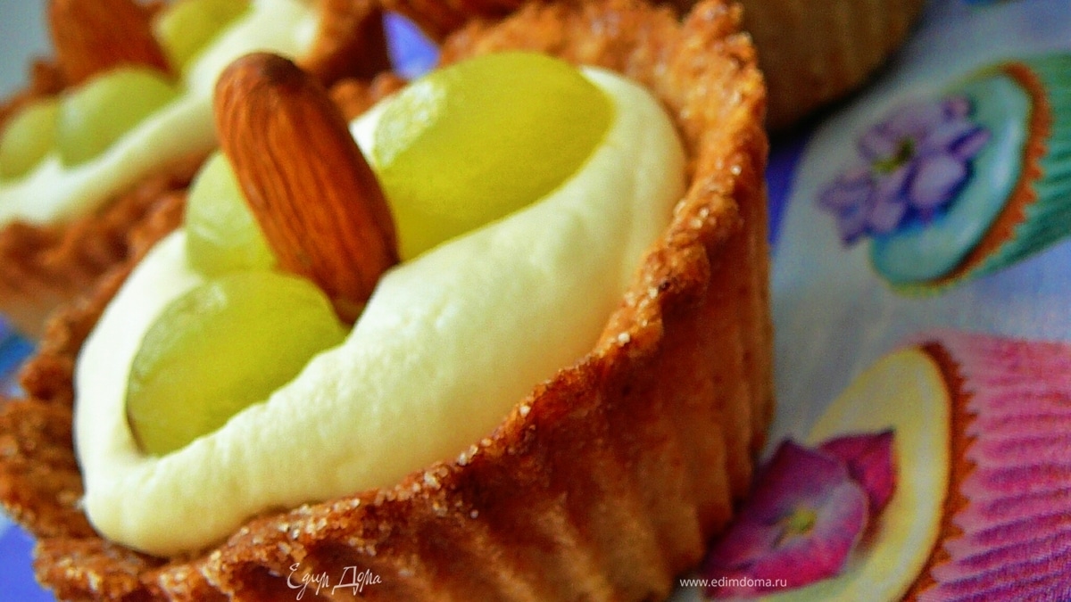 Сверху украсить ягодами чищенного винограда,без косточек и миндалем.Перед подачей поставить тарталеки в холодильник на 1 час.