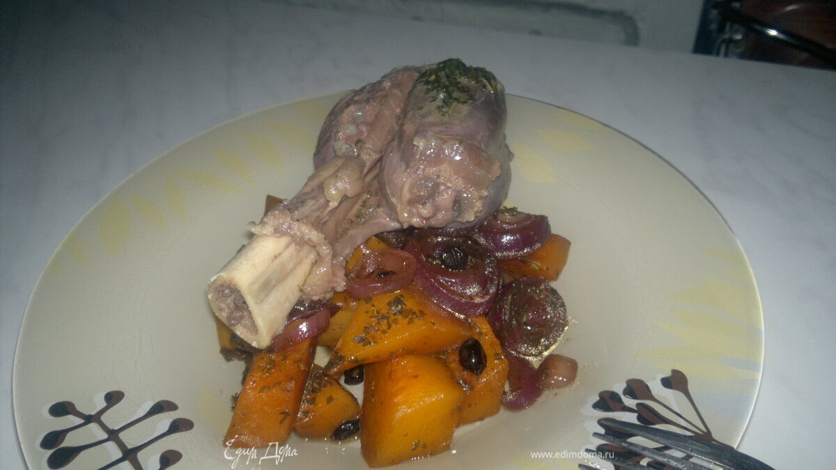 Голяшка барана и гарнир из сладкой тыквы и лука