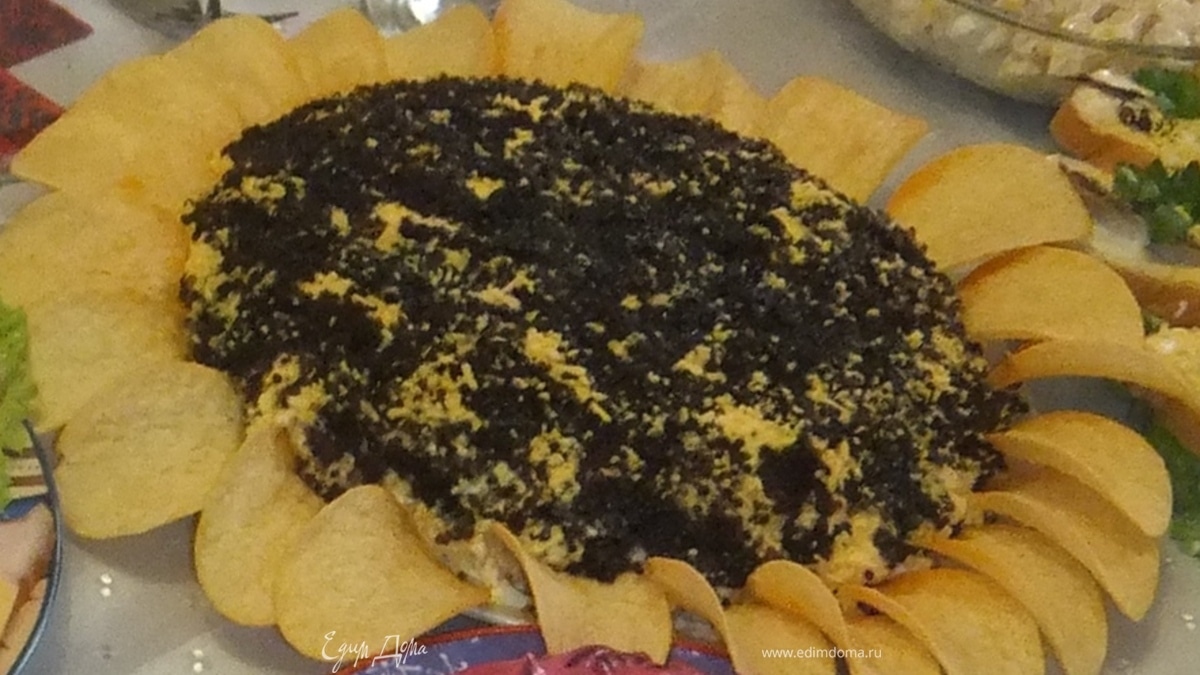 - Шаг 2Порезать первый слой грудку ,помазать майонезом,второй слой порезать грибы ,полить майонезом , отжать лук и посыпать сверху ,посыпать потертым на крупную терку белком яйца , полить майонезом ,натереть на мелкую терку желток и посыпать . Сверху разложить икру .По кругу чипсы .