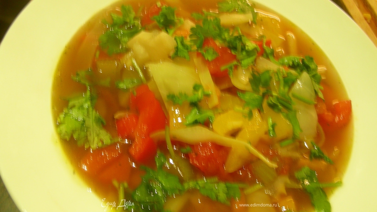 Люблю я разные супчики, стараюсь есть их почаще, желательно еще и разные)) вот приметила у Гастронома такой рецептик легкого овощного супчика)) набор овощей довольно обычный, интересно то, что перцы и помидоры запекаются на гриле или в духовке и добавляются в суп в самом конце)) к этому супчику в паре должны идти чесночно-томатные гренки, у меня сегодня без них, к сожалению, хлебушек закончился)) супчик получается очень легкий и овощной, можно готовить его на воде (как в оригинале), а можно, как я, на бульоне (овощном или курином)) Попробуйте и Вы))