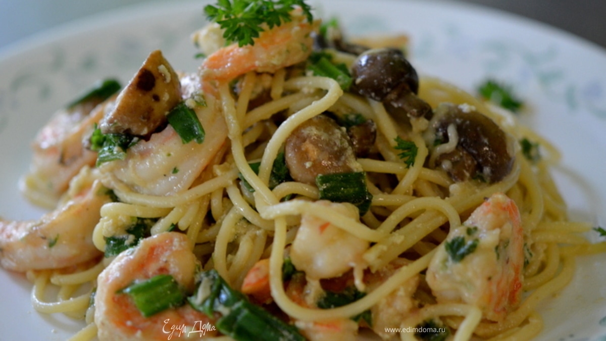 Спагетти с креветками и грибами