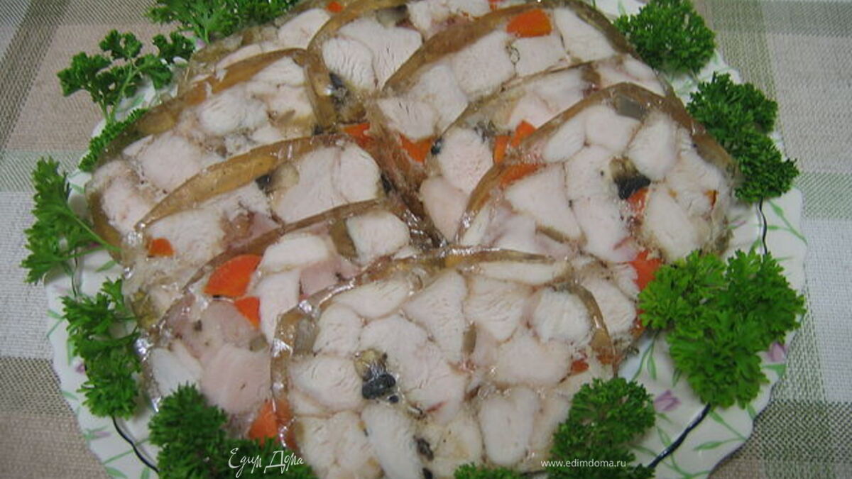 Срезать с курицы филе, порезать на кусочки, посолить, поперчить, посыпать сухим желатином, перемешать. Я ещё добавила морковь (морковь сварить до полуготовности) и шампиньоны. Положить всё в чистую коробку из под сока, коробку закрыть и хорошо завязать. Поставить в кастрюлю с водой ( воды должно быть не меньше чем 3/4 от высоты коробки) и варить после закипания воды 1 час. Вынуть коробку из воды, остудить и поставить в холодильник для застывания (лучше на ночь). Затем разрезать коробку и вынуть заливное.