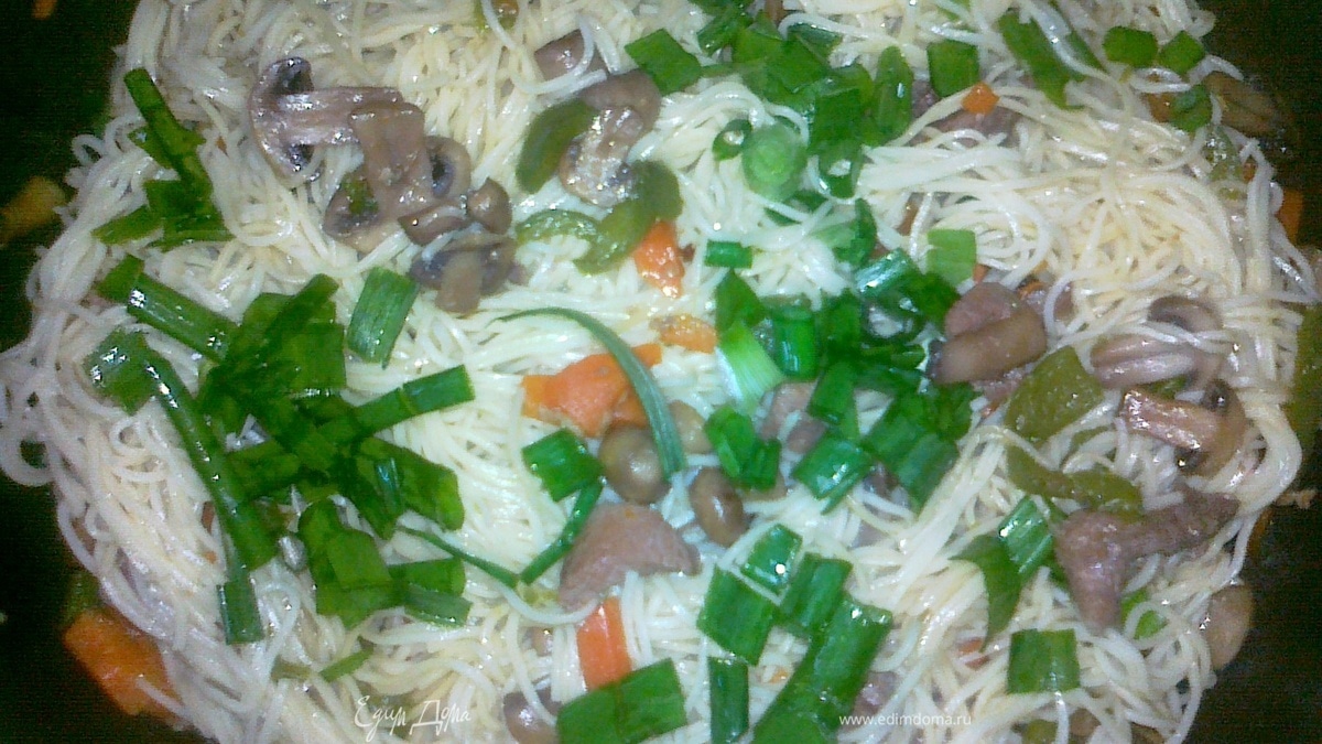 - Шаг 3В чистом казане или воке разогреть оставшееся масло и обжарить чеснок и корень имбиря.Добавить морковку и жарить 1 минуту, затем добавить грибы и обжарить еще минуту. Добавить болгарский перец и также обжарить минуту.Добавить свинину, соль и куриный бульон и прогреть.Смешать с лапшой, добавить пророщенные зерна и перемешать.Украсит зеленым луком.