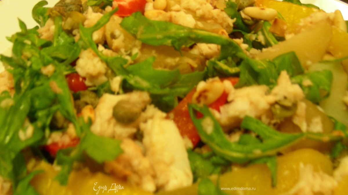 Руколу моем, сушим, выкладываем в салатницу. Нарезаем перец полосками, картофель крупными кусками, рыбку произвольными кусочками. Все добавляем в салатницу. Взбиваем масло с уксусом, солью и перцем (+лимонный сок по желанию), добавляем каперсы. Заправляем салат и добавляем кедровые орешки. (Можно сделать немного по-другому: заправить только картофель, на порционные тарелки выкладываем рукколу, сверху помещаем картофель, кусочки рыбы и перца, посыпать кедровыми орешками.) Я его подавала уже остывшим, но мне кажется, что и теплый он должен быть очень вкусный)