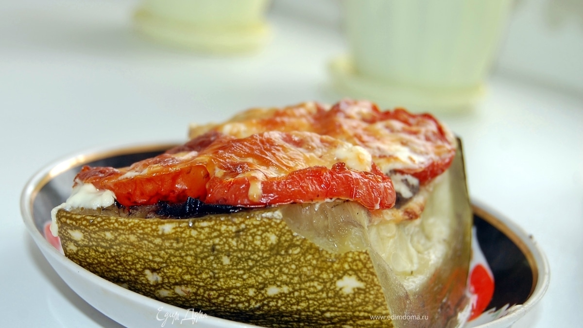 Фаршированный кабачок мясным фаршем с грибным соусом, с помидорами под сыром
