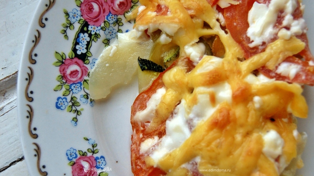 - Шаг 1Все овожи кроме моркови режем кольцами,очень тонко мм 2-3,морковь трем не крупной терке.Выкладываем слоями: кабачок, картофель,морковь, помидоры. Сверху смазываем майонезом, и Посыпаем сыром. Выпекать при 200С.30минут.