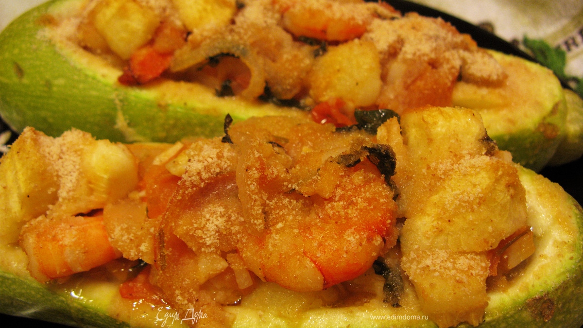 Небольшой противень застелить фольгой и смазать ее сливочным маслом. Кабачковые лодочки положить на фольгу, посолить изнутри и посыпать половиной сухарей. Начинить кабачки креветками с овощами, сверху посыпать начинку оставшимися сухарями. - Шаг 7