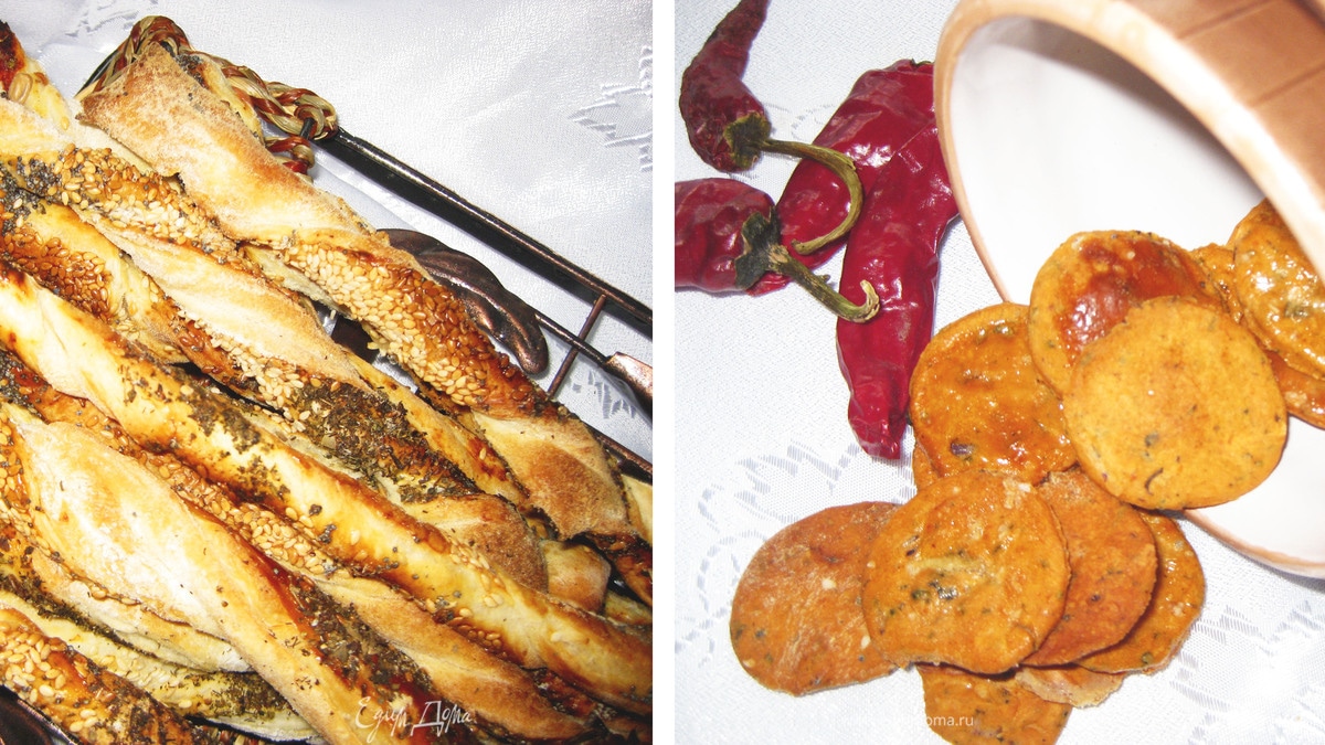 Идеи для пивного стола. №1.томатный крекер с базиликом. №2.слоеные спиральки с маком, кунжутом, семечками и травами.