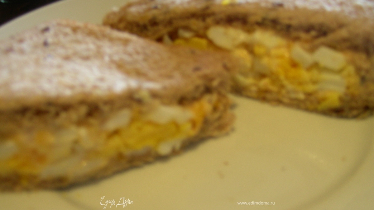 Яйца рубим или нарезаем кружочками (мне так больше нравится, они не высыпаются). Намазываем йoгуртовую смесь на хлеб (на 2 или на 4), затем выкладываем яйца и накрываем вторым кусочком. - Шаг 4