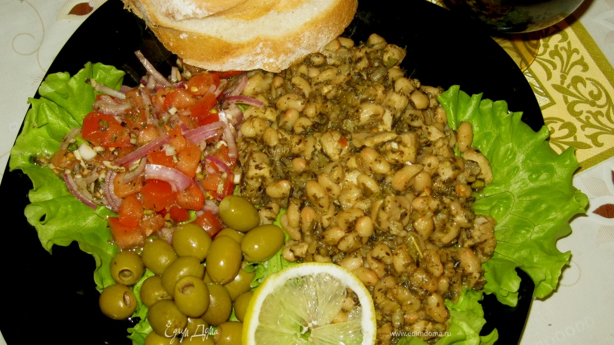 - Шаг 1Фасоль лучше сварить самому, но у меня на это нет времени, поэтому я взял две четырехсотграммовые банки белой консервированной. С трех куриных бедрышек срезал мясо и порезал небольшими кусочками, а кожу и кости поставил вариться в стакане подсоленной воды. Шкурку одного лимона (верхнюю желтую часть), пять веточек петрушки, десять крупных листиков зеленого базилика, листья с четырех веточек розмарина и дюжины веточек тимьяна перемолол в блендере с чайной ложкой крупной соли. Еще добавил укроп, хотя в Греции эта трава не используется. Отдельно покрошил три зубчика чеснока и размял их вилкой, добавив щепотку соли. Нарезанную курицу смешал с пятью столовыми ложками душистой зелени, чесноком, и соком одного лимона, добавив чайную ложку сахара. Так же добавил четыре листика лаврушки, хорошенько размяв их в ладони, и немного молотого черного перца. Пока курица маринуется, спассировал на оливковом масле две мелко порубленных головки лука. На том же масле, на большом огне, слегка обжарил курицу до светло золотистой корочки. Глиняный горшок ополоснул кипятком, на дно налил пару столовых ложек оливкового масла и уложил слоями фасоль, лук и курицу, так что бы верхним и нижним была фасоль. Через ситечко вылил бульон и, не накрывая крышкой, поставил на 20 минут в духовку, разогретую до 120 градусов. Пока мое блюдо готовилось, приготовил салат из помидоров, красного салатного лука и чеснока. Добавил в него оставшуюся в блендере зелень, лимонный сок и заправил оливковым маслом. Горячий горшочек вынул из духовки и перемешал содержимое. Пусть постоит пять минут, наполняя кухню ароматами трав. Готовое угощение, щедро разложил по тарелкам, рядом положил салат из помидоров и, конечно же, оливки. Перец пусть каждый сам добавляет по своему вкусу. Под такое блюдо можно выпить по бокалу вина или закусить свежим хлебом, обмакнув хлеб в красное полусухое.