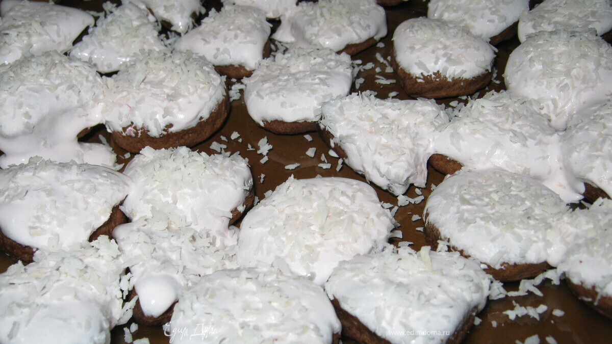 Готовим белую глазурь. Взбиваем холодный яичный белок с сахарной пудрой. Берем слегка остывшее печенье, смачиваем в глазури и сверху хорошо притрушиваем кокосовой стружкой. Приятного аппетита!!!