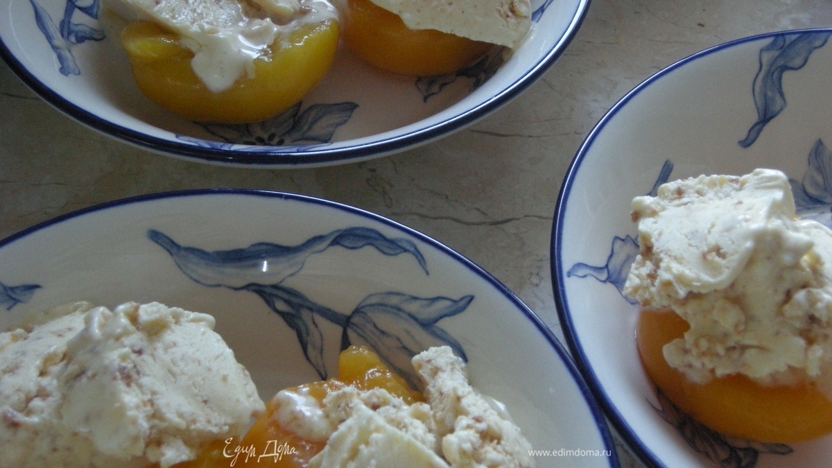 Этому рецепту я научилась на кулинарных курсах в Хорватии, у очень талантливого кулинара Марины Сангиетти, благодаря которой я научилась правильно готовить многие Итальянские блюда, да и не только Итальянские;) Семифредо - это тип итальянского мороженного, в переводе означает полузамороженный, десерт готовится очень быстро, подается с консервированными персиками (можно и со свежими, чуть их запечь в духовке, посыпав сахаром), подходит для большой компании - вынул из морозилки - и готово! А Амаретти - это традиционные итальянские печенюшки, с ароматом Амаретто. Ими даже простое ванильное мороженное можно посыпать и уже другой эффект!