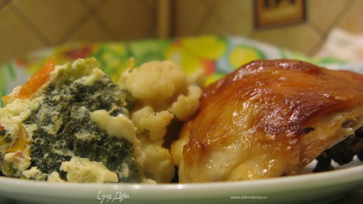 Запекать в нагретой до 200 градусов духовке пока ножки не зарумянятся, затем накрываем фольгой и опять в духовку на 30 мин. Ужин из курицы с гарниром из овощей готов! Приятного аппетита!Чтобы проверить готовность курицы, проколите ножку — сок должен быть прозрачным. Фольга поможет сохранить сочность мяса и предотвратить чрезмерное зарумянивание.