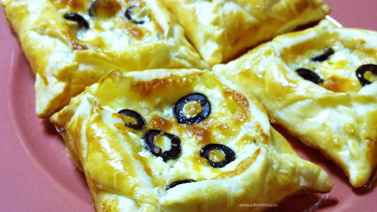Слоеное тесто тонко раскатать, нарезать на квадраты. В центр квадрата выложить сыры слоями, не смешивая (филадельфию выкладывать чайной ложкой небольшими кусочками). - Шаг 3Сверху выложить маслины, завернуть конвертик, скрепить и отогнуть края. Повторить действие с остальным тестом.