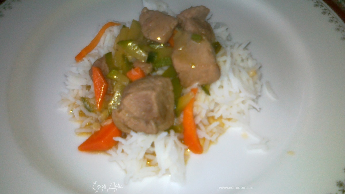 - Шаг 5Добавить к овощам свинину и крахмальную смесь, довести до кипения и тушить до готовности овощей.Подавать с рисом.