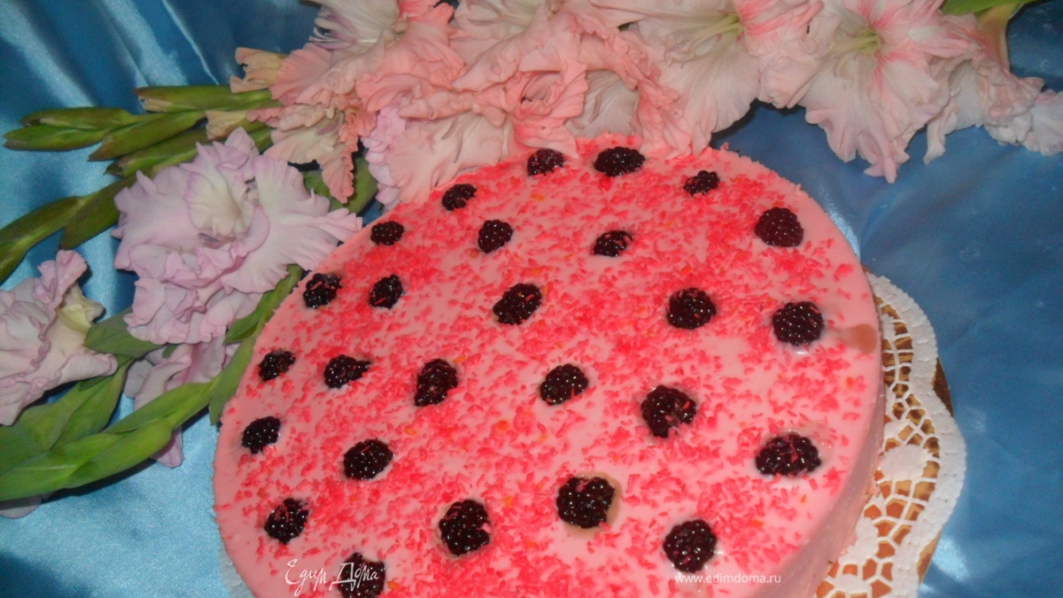Выложить крем на коржи, пропитанные сиропом из кокосового молочка с ромом. Кокосовые орехи распилить и вычистить мякоть, натереть на терке и посыпать торт кокосовой стружкой. (Я немного видоизменила этот торт по сборке. Белый корж, крем, темный корж, крем. В крем добавила несколько капель сока ежевики, чтобы торт выглядел попраздничнее)