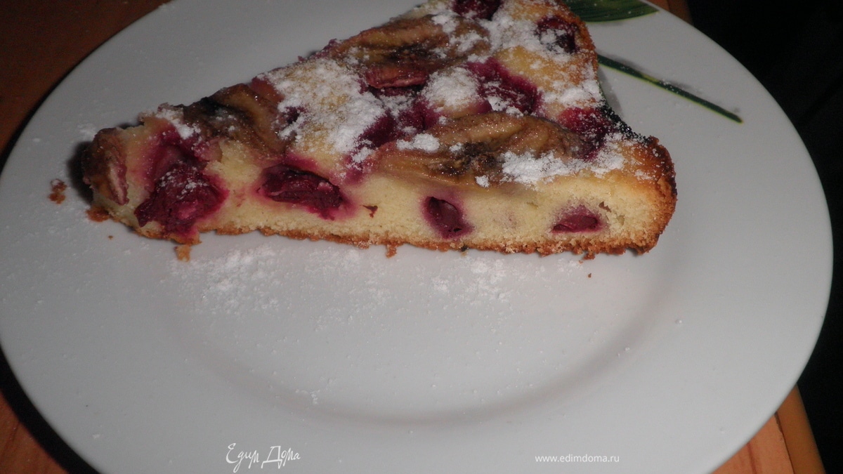 обе смеси соединяем, добавляем просеянную муку и замешиваем тесто. Затем берем форму, смазываем сливочным маслом, присыпаем панировочными сухарями и выкладываем тесто. Сверху выкладываем вишню, которую предварительно разморозили и дали ей стечь. Вишня должна быть максимально сухая, иначе бисквит плохо поднимется. Далее выкладываем нарезанные кружочками бананы. Ставим в разогретую до 180 градусов духовку на 35 мин. Пока пирог печется духовку открывать нельзя иначе бисквит может упасть. - Шаг 4когда пройдет 35 минут. Выключите духовку, но пирог первые 10 мин. не вытягивайте. Далее, когда вытащите пирог, не трогайте его еще минут 20. И только потом подавайте посыпав сахарной пудрой.