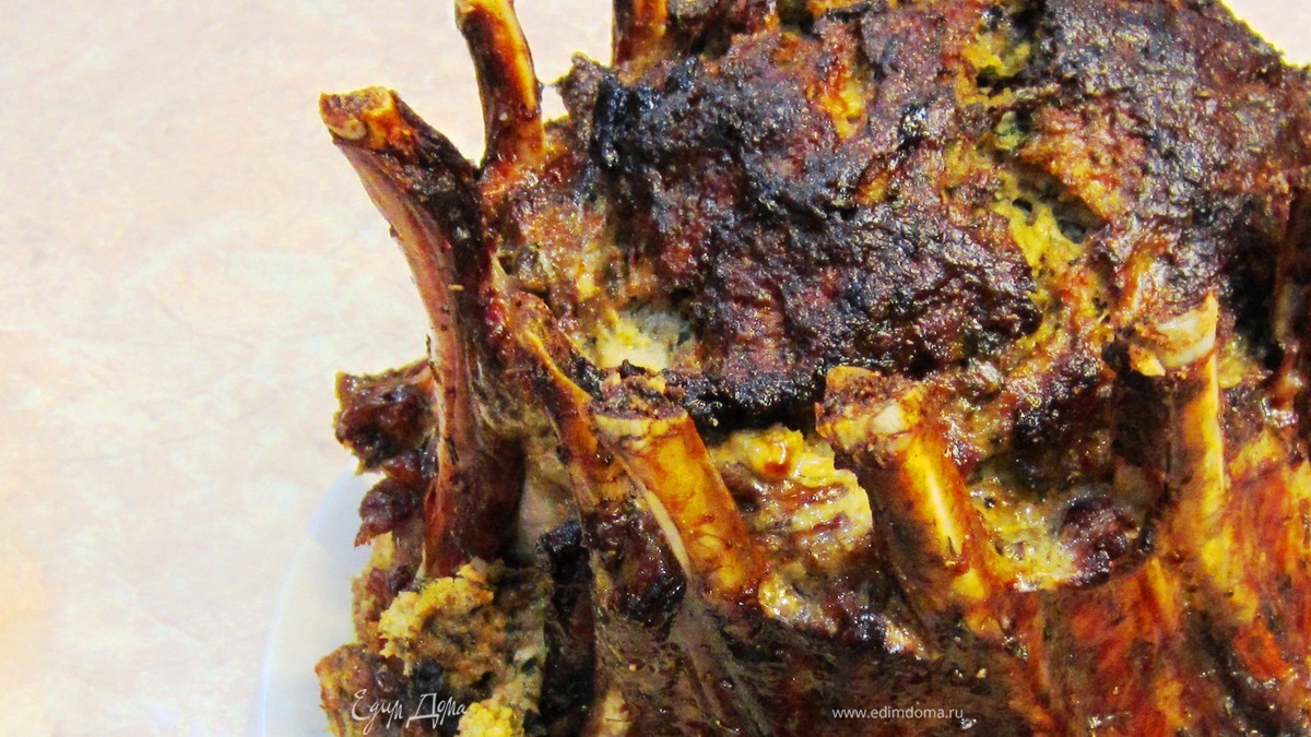 Теперь самое сложное. Сложите две корейки в форме "короны" ребрами наружу, как это видно на фотографии. Посмотрите внимательно. Если на ваш взгляд где-то мешает мясо - срежьте его. Возьмите два полуметровых куска хлопчатобумажного шпагата. Там где части мяса соединяются зацепите соседние ребра внизу шпагатом. Перекрутив концы, зацепите верха ребер теми же концами и завяжите шпагат на узел. Сделайте тоже самое с двумя другими концами корейки. Лишние концы шпагата обрежьте. Проверьте, чтобы расстояния между ребрами были примерно одинаковые.