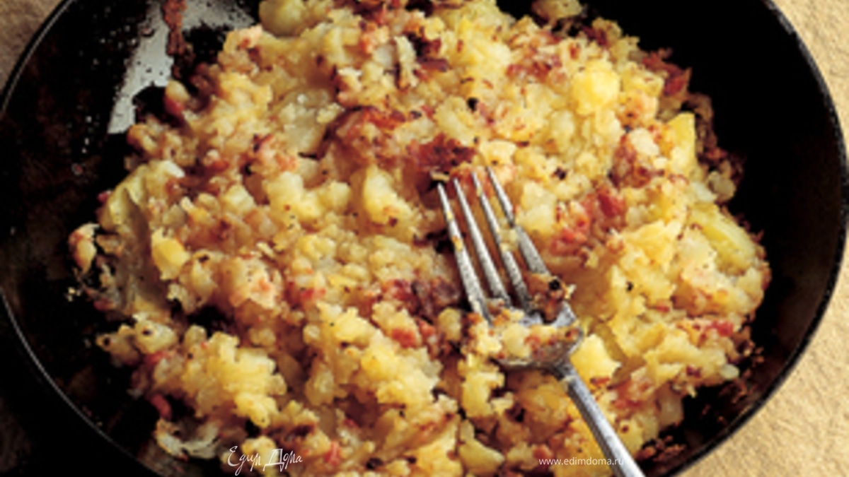 - Шаг 1Отварить картофель в мундире от 15 до 20 минут. Слейте воду, слегка охладите, затем очистить и порежьте на тонкие дольки. Бекон с луком обжарить на среднем жару,помешивая, около 6 минут. Добавить картофель, бульон, соль и щепотку перца. Подавить картофель чуток вилкой, уменьшить огонь до среднего и варить-жарить (не мешать) до хрустящей корочки, от 8 до 10 минут. Подавать теплым.