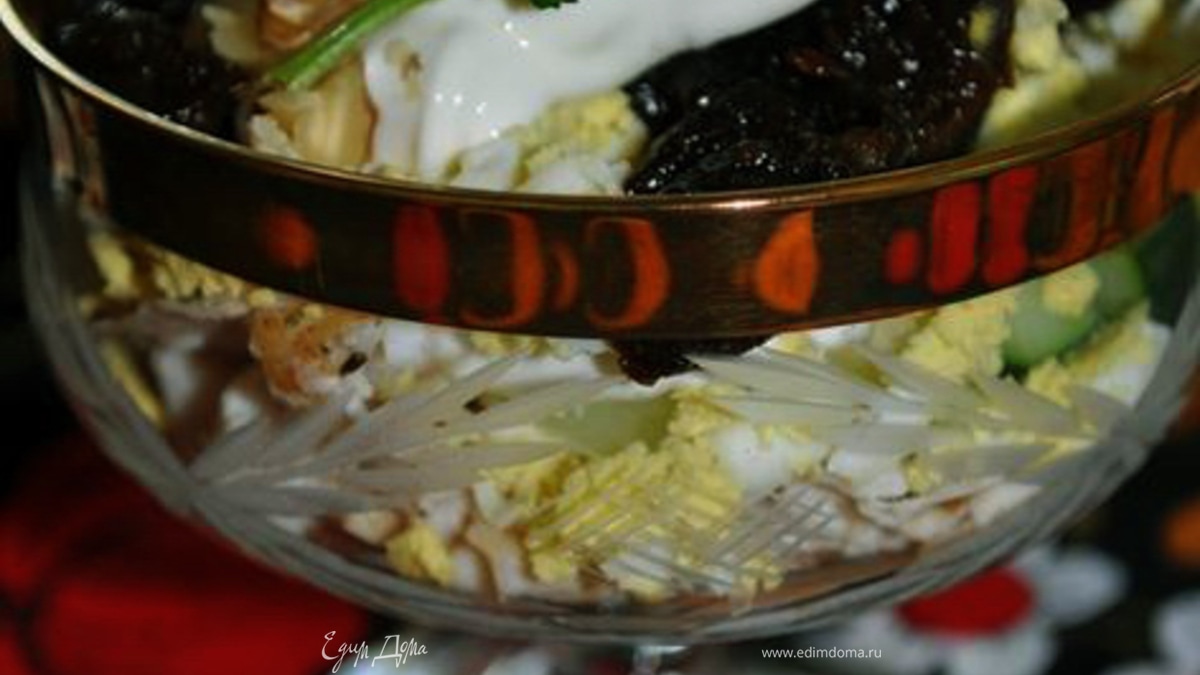 - ПодготовкаЧернослив припустить,охладить.Отварное курин. филе,огурец,чернослив нашинковать мелкой соломкой, яйцо мелко порубить,орехи измельчить.Уложить все продукты слоями в креманки, полить сметаной с майонезом,украсить зеленью и орехами.