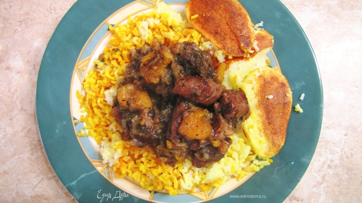 Через 40 минут тушения добавьте сухофрукты в мясо. Продолжайте тушить еще 30 минут под крышкой, периодически помешивая. В конце готовки посолите мясо. Попробуйте и досолите, если нужно. Выключите огонь и поперчите Гора. Дайте постоять мясу в кастрюле минут 10. Верхний слой риса перемешайте, чтобы куркума лучше разошлась. - Шаг 23